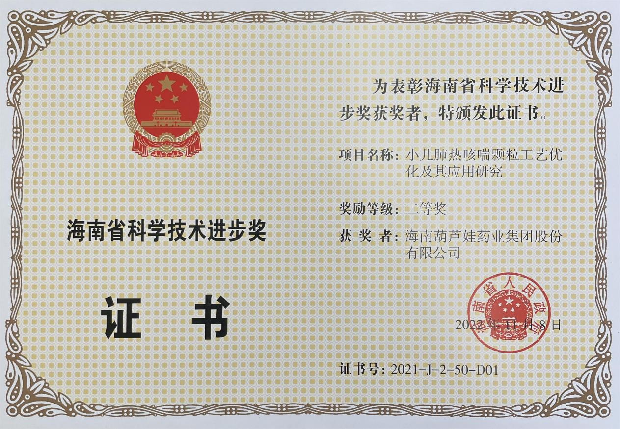为此,小儿肺热咳喘颗粒的制备方法获得了第二十一届中国专利优秀奖(2019年),专利申请号:ZL201010134951,此次作为专利技术的应用,获得了2021年度海南省科学技术进步奖二等奖。在此之前,英国上市公司365牌小儿肺热咳喘颗粒还多次被授予“临床价值中成药品牌”、“中国连锁药店最具合作价值单品”,荣登“中国医药品牌榜”。